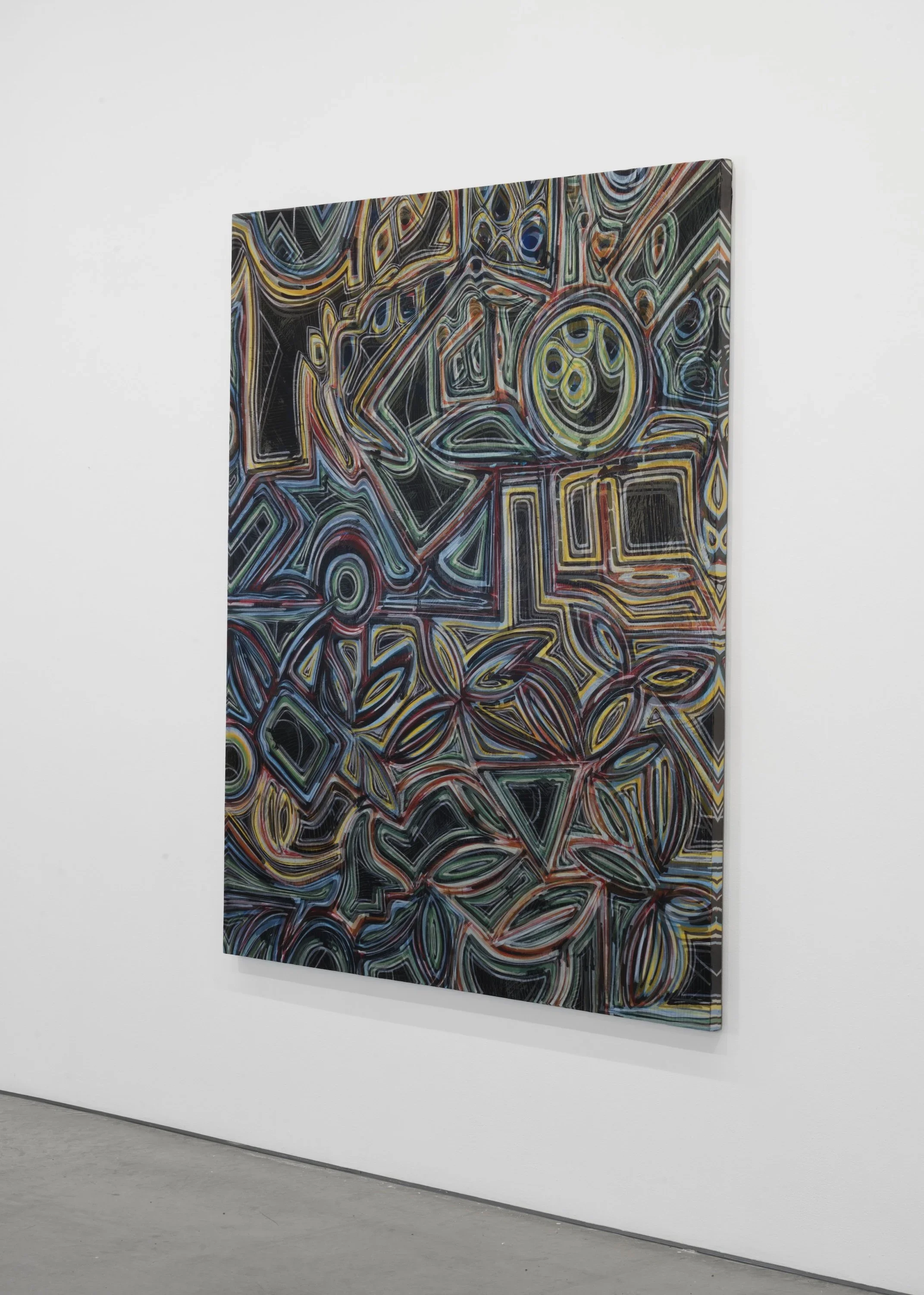 When I started out as an artist, I was intent on making things that were “anti-illusionistic.” At the time I wanted directness, to avoid obfuscation, to deny smoke and mirrors and fakery. What you saw was what you saw. I wanted the solidity of a firm foundation, like the predictability of parallel lines or civic holidays. For me, this meant painting backward, like a printmaker: adding layers of pattern and colour over many work sessions, then using tools (rubber combs, spatulas, branches, sponges) to pull away still-wet paint and reveal the layers underneath.